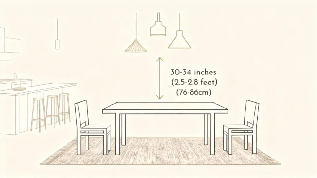 These measurements provide adequate clearance for comfortable seating and prevent the light from obstructing the view during meals.